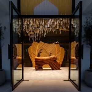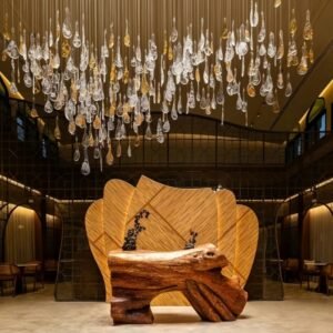 Some components of the installation feature luxurious golden accents, harmoniously complementing the restaurant’s warm interior palette of wood and beige. FLUO’s Head Designer YanPEI closely collaborated with acclaimed interior designer Marco, ensuring the piece flawlessly integrates into the carefully designed interior.