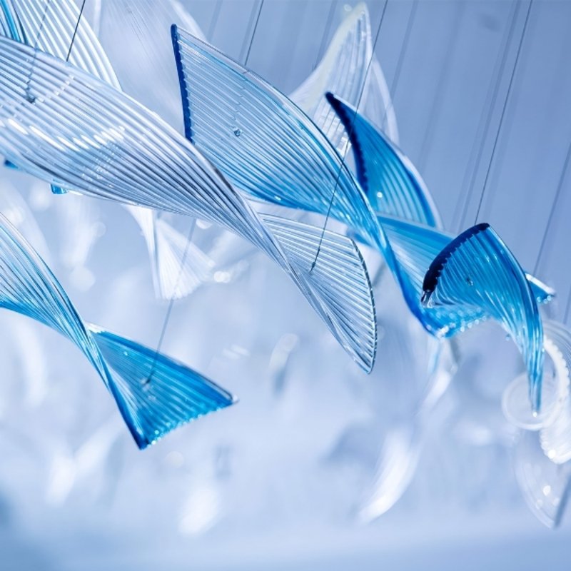 A stream. Stream of light, stream of sky-blue water, data stream, stream of cash flowing through the city of London. In this simple and delightful installation, a great many of symbolic meanings are to be looked for and found.